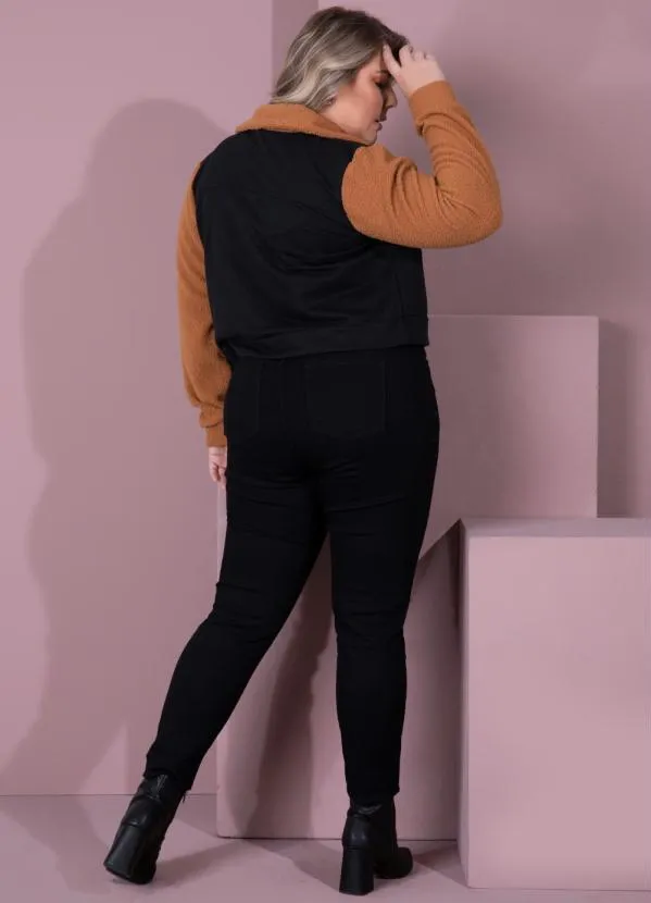 Quintess - Casaco em Moletom Preto e Caramelo com Pelinho