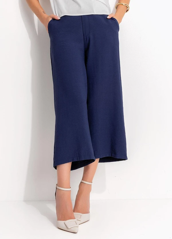 Calça pantacourt azul marinho em tecido leve de alfaiataria. Possui modelagem ampla com caimento fluido, cós reto com fechamento por zíper e botão frontal. Sofisticada e versátil, é ideal para composições modernas e elegantes.