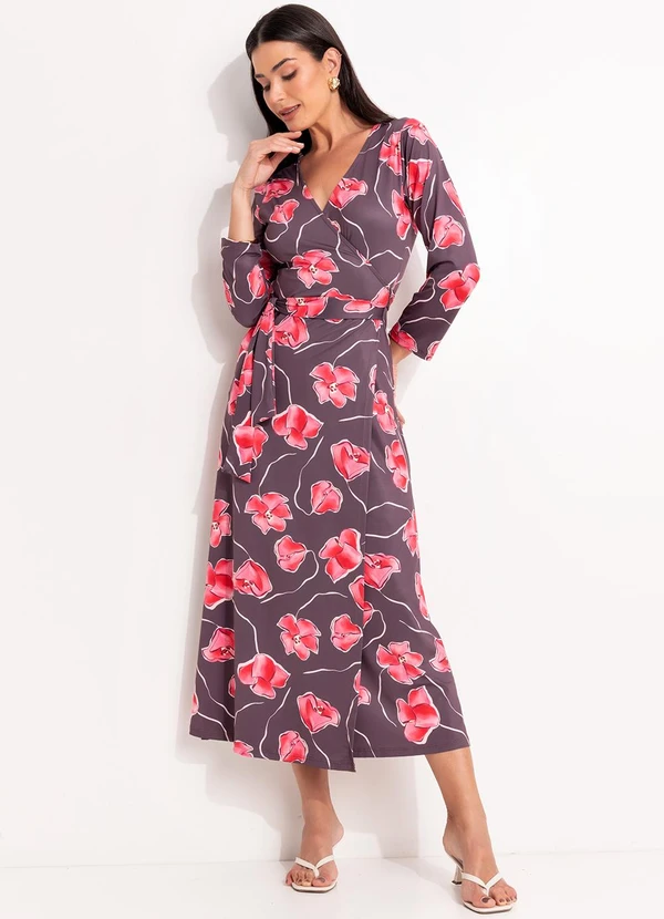 Quintess - Vestido Floral Marrom em Malha Fria