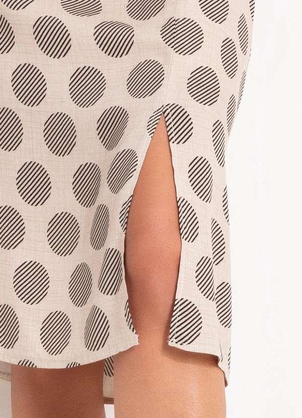 A peça apresenta uma estampa de poá (bolinhas) em contraste preto sobre fundo claro, um clássico que facilita a combinação com diversas cores de blusas. A fenda frontal lateral não é apenas um detalhe estético; ela permite o passo livre e confortável. O fechamento é feito por um zíper invisível na parte traseira, mantendo o acabamento limpo e discreto.
