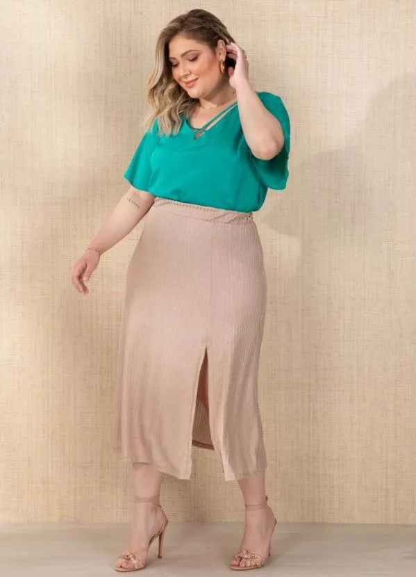 Saia em malha canelada de poliéster e elastano com brilho. Modelo cintura alta com elástico e fenda. Comprimento midi.