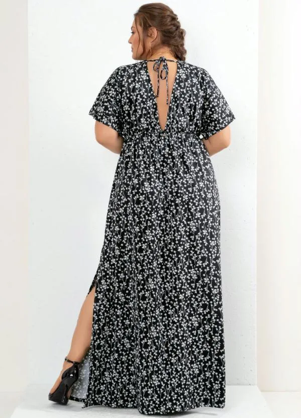 Quintess - Vestido Longo Floral Preto com Decote Profundo